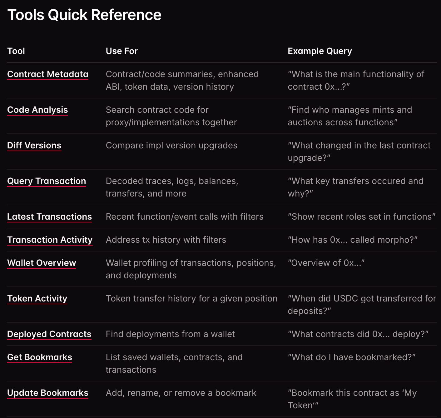 Herd has built the most searchable and human-readable Ethereum block explorer over the last year, and we’re now releasing an MCP that includes all the functionality of our explorer (and more). It’s a set of tools focused on navigating the “unknown unknowns” of onchain relationships, with lookup functions for every transaction type to enhance planning and QA validation. It also includes bookmarking tools that let you easily reference the same contracts, wallets, and transactions across chats.